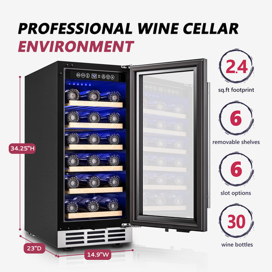 Simzlife 15" Beverage Cooler, 32 Bottle Wine Fridge with Glass Door, Under Counter Built-in or Freestanding, 24.3 in W, 33.7 in H