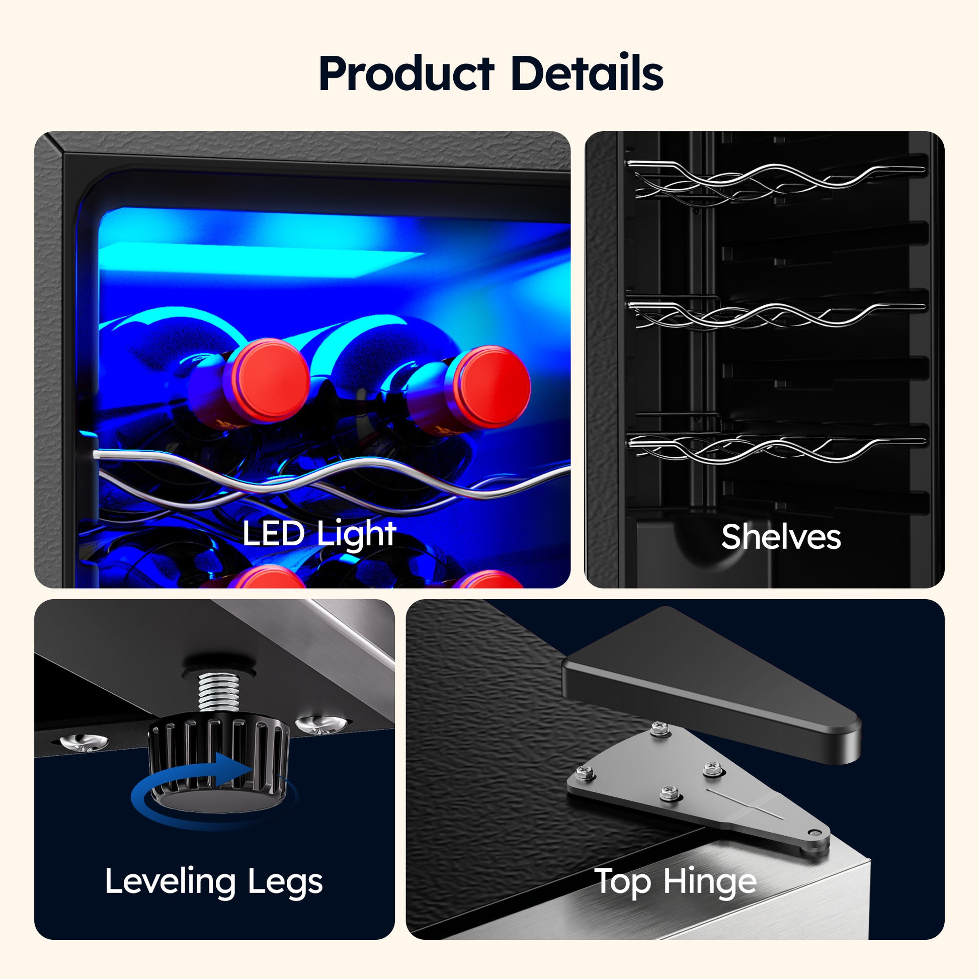 Electronic touch controls allow easy adjustment within the 41–64°F temperature range, ideal for storing red, white, rosé, and sparkling wines. The internal fan cooling system ensures even temperature distribution for better wine preservation. -