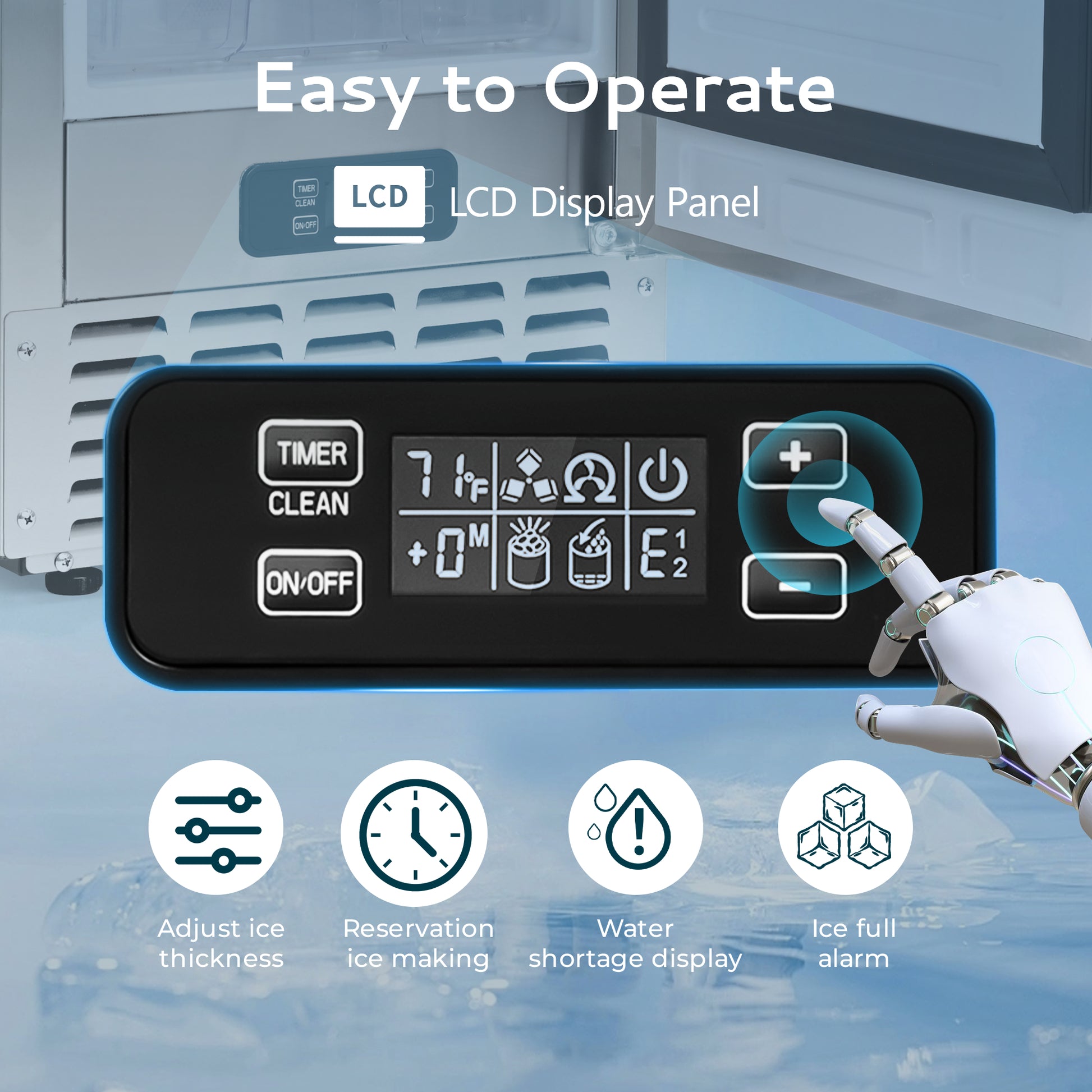 A crystal-clear LCD panel allows effortless control of ice thickness, cycle settings, temperature monitoring, and cleaning functions. Auto alerts notify you instantly when the ice bin is full or water is low, ensuring uninterrupted ice production. The programmable timer lets you schedule ice-making sessions around business hours, events, or daily routines.