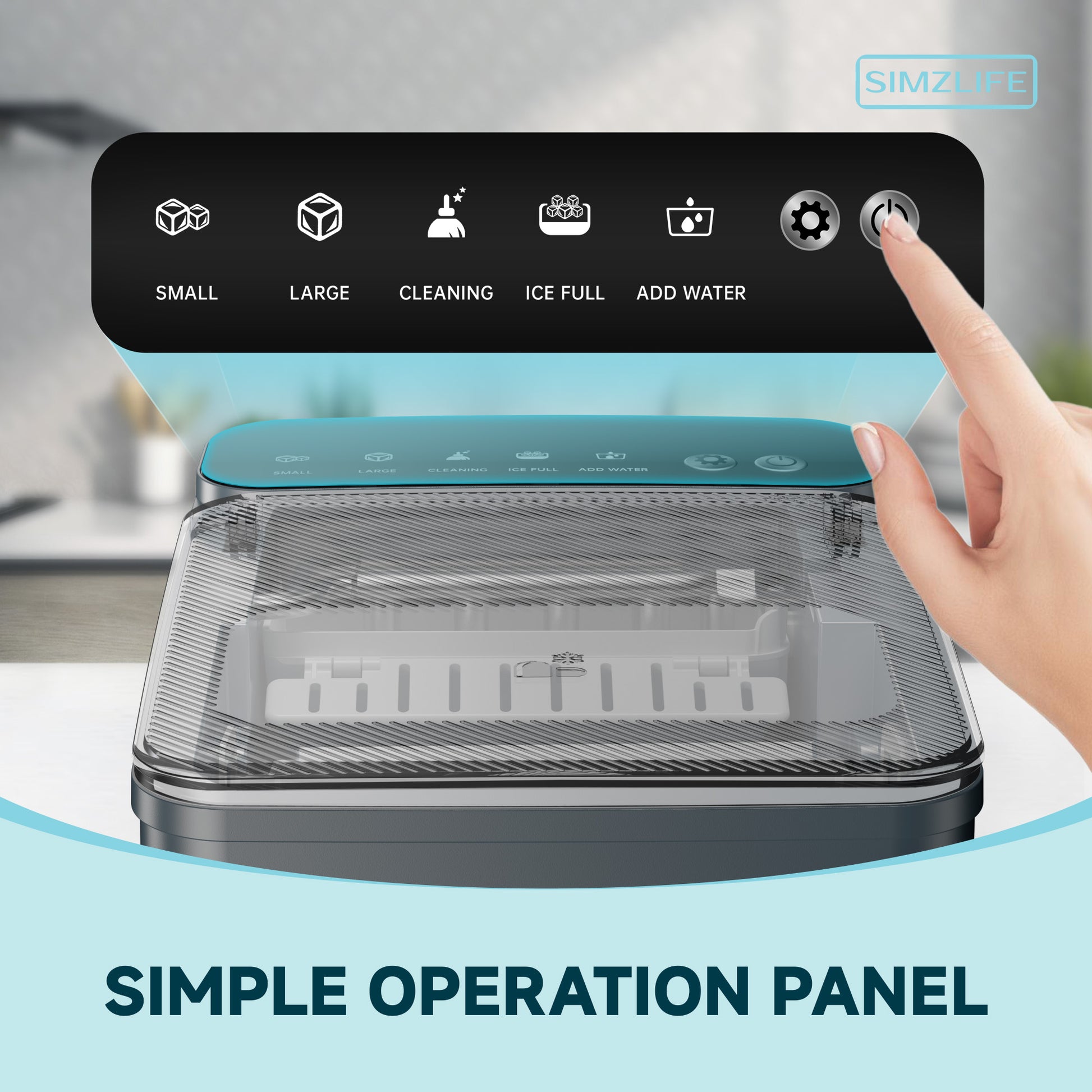 EASY TO CONTROL:The control panel is very easy to operate. Fill the ice maker with water, press the on button and select the size of the ice cubes. An indicator light will come on when the water is low or the ice basket is full. SELF-CLEANING AND PORTABLE: Simply press the on/off button for 5 seconds to start the self-cleaning program. The machine will recirculate the poured water. The Simzlife Ice Maker is compact, measuring 8.15 x 11.65 x 10.98 inches.